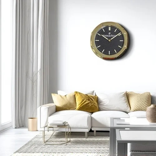 A refined AP Wall Clock inspired by the iconic Royal Oak design. This 34 cm Gold & Black Edition features a brushed octagonal bezel, luminous markers, and a silent sweep movement — a bold luxury décor piece for modern interiors.