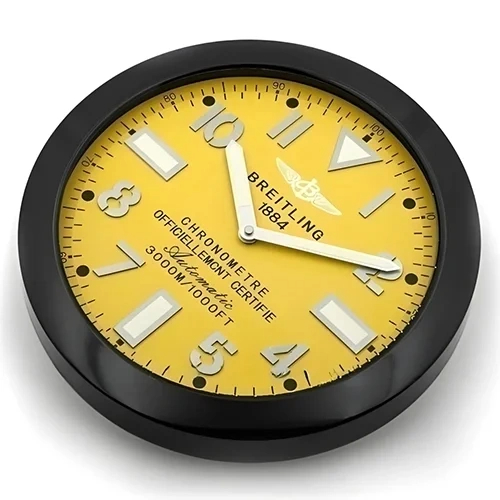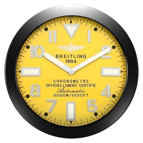 Featuring a vivid yellow dial with black accents, this wall clock captures the recognizable aviation aesthetic associated with Breitling instruments. The luminous markers ensure visibility day and night, while the silent sweep movement delivers smooth, quiet timekeeping without ticking noise.