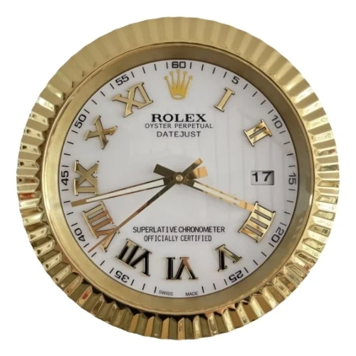 Upgrade your interior décor with this Date-Just Wall Clock – Roman Dial Gold & White Style (34 cm), a beautifully engineered wall piece inspired by the timeless aesthetics of iconic Swiss watch design. Featuring a striking combination of a golden Roman-numeral dial and a crisp white face, this wall clock delivers both a luxurious presence and everyday practicality.
