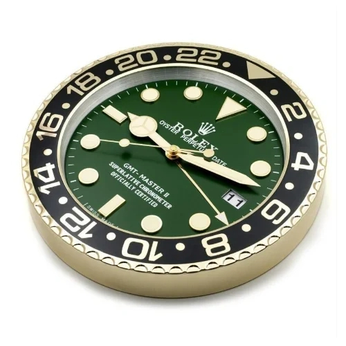 Bring bold elegance and iconic sport-luxury character into your space with this 34 cm GMT Master II wall clock, featuring a striking green dial paired with a gold bezel. Inspired by legendary professional travel watches, this piece blends classic watch aesthetics with modern interior décor.