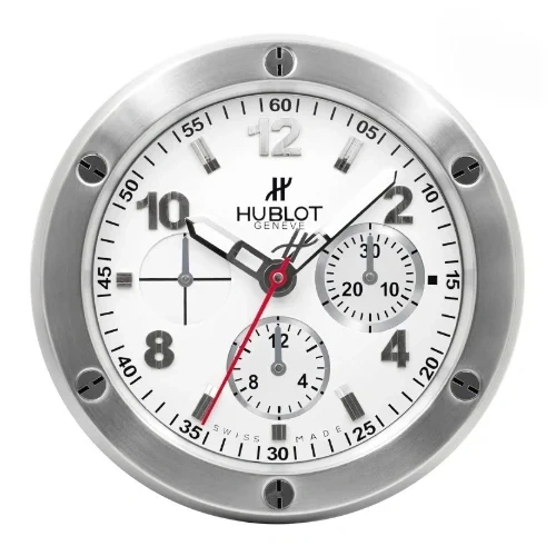 This Hublot wall clock is inspired by the iconic Big Bang design language, combining a silver and white chronograph-style dial to deliver a refined and sophisticated interpretation of modern luxury.